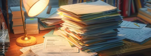 Stack of legal documents on a desk with a criminal record on top, top-down view, bright desk lamp illuminating the scene