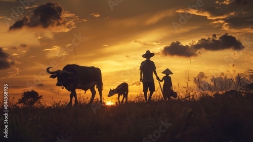 Photograph of the silhouette of an Asian family's lifestyle. Man with buffalo and children, countryside, Thailand