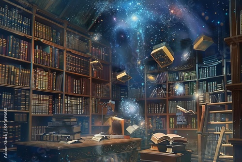 A wizard s library with floating books and miniature galaxies, Magical, Cool tones, Digital art, Enchanted study