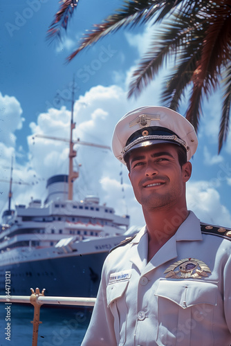Vintage style, muted colored image, navy sailor / cruise purser in front of a cruise ship.
