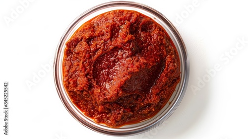 Aerial shot of Harissa paste, deep red and speckled with spices, in a simple glass dish, isolated on a white background, professional studio lighting