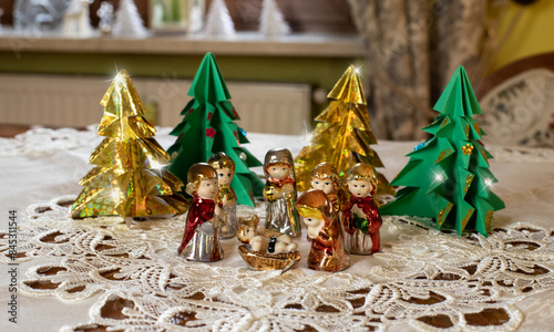 Szopka Betlejemska z Jezusem, Maryją, trzema apostołami, choinkami i zwierzętami. Świąteczny nastrój