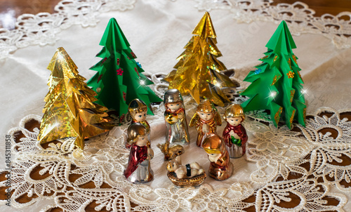 Szopka Betlejemska z Jezusem, Maryją, trzema apostołami, choinkami i zwierzętami. Świąteczny nastrój
