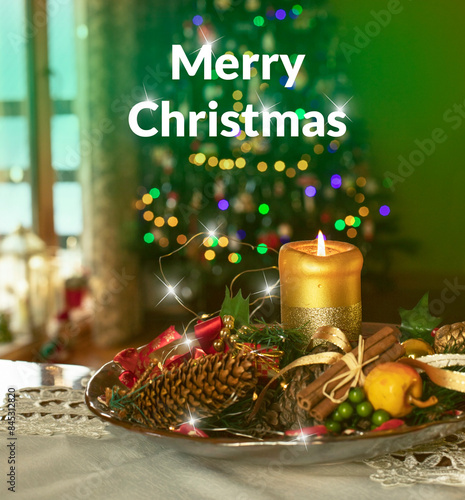 Szopka Betlejemska z Jezusem, Maryją, trzema apostołami, choinkami i zwierzętami. Świąteczny nastrój z napisem "Wesołych świąt"