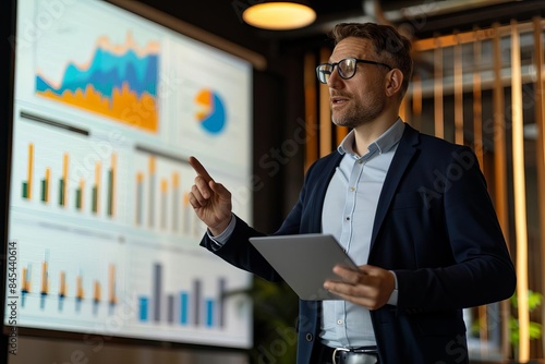 Confident speaker leading a dynamic business session, vibrant presentation slides, modern conference room, professional attire