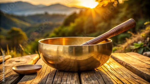 Golden Tibetan Singing Bowl And Mallet, Activated By Gentle Strikes, Generate Soothing Vibrations For Harmonious Balance And Relaxation.