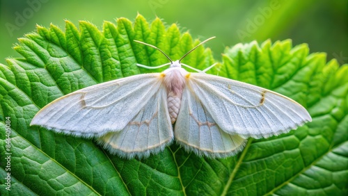 White silk moth sitting on green leaves, silk moth, green leaves, nature, insect, top view, wide panorama, wildlife, outdoor, macro photography, beautiful, delicate, wings, white color