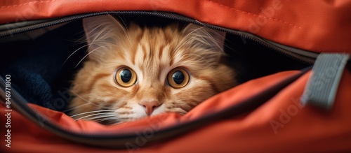 Red feline concealed within a travel sack in a close-up shot. with copy space image. Place for adding text or design