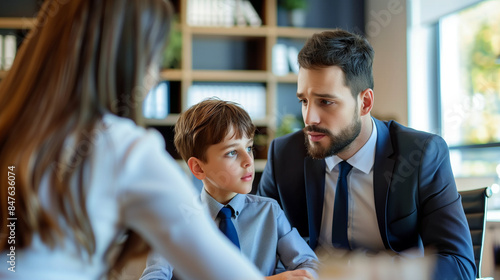 Young Father and Son in Principal's Office, Discussing with School Principal about his Childs behaviour and preventing from being expelled