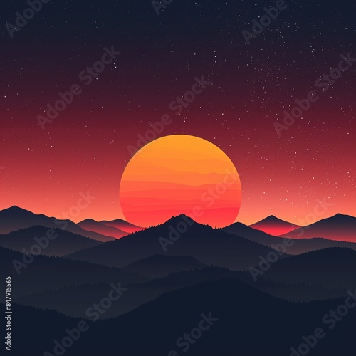 Stunning sunset over mountain landscape with starry sky