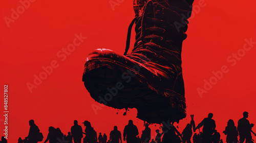 Dominance and Oppression: giant boot crushing silhouetted crowd against a stark red background.