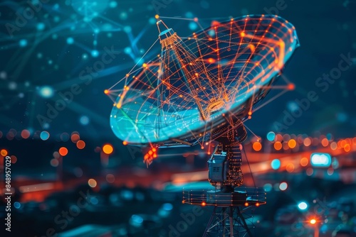 Satellite dish with a digital communication network overlay, blending seamlessly, high-definition detail, global communication, advanced satellite technology, vibrant design