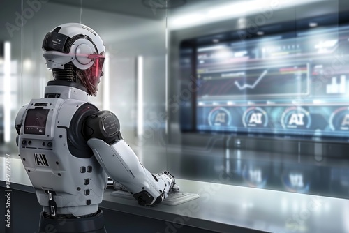 Humanoid robot at a control panel in a data center, highlighting the integration of AI in data management