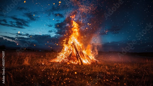 Huge bonfire in the field at night, summer solstice festival, sparks flying upwards, starry sky
