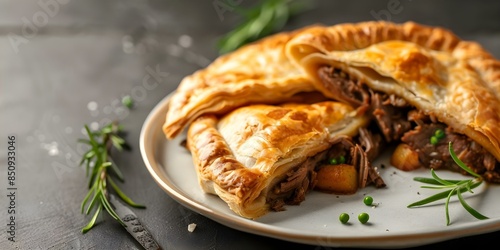 A plate of Cornish pasty with beef potatoes onions and swede. Concept Food Photography, Cornish Pasty, Traditional British Cuisine, Comfort Food, Delicious Treats