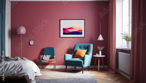 An ordinary bedroom featuring a solitary comfortable chair, embellished in lively tones against a plain backdrop, creating a modest yet comfortable retreat for unwinding, Generative AI