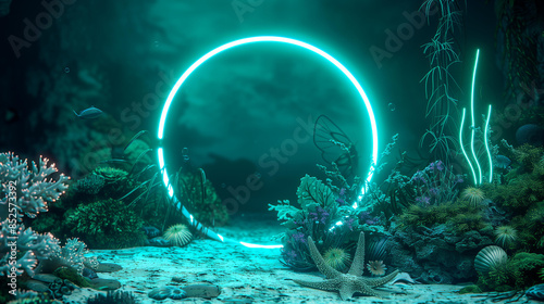 3D render of a circular glowing neon frame underwater with corals and seaweed , seashells, sea star , jellyfish with a dreamy and minimalist aesthetic using a green and blue color palette