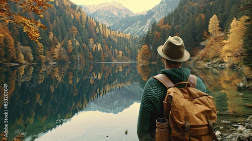 A traveler with a backpack and a hat stands near a lake against the backdrop of autumn forest mountains, rear view. Picturesque landscape of a tourist looking at the surface of the water.
