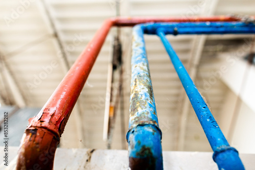 vecchi tubi lunghi rossi e azzurri, con segni di usura, che si estendono verso l'alto all'interno di un edificio