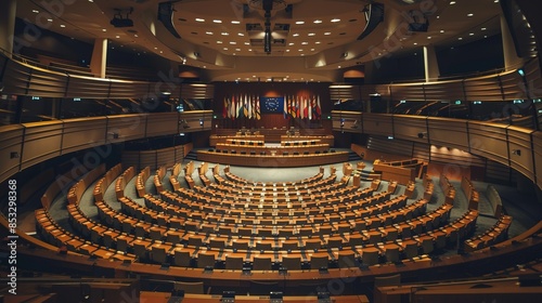 Modern legislative assembly hall with curved seating and a large stage. Image representing a political or formal meeting setting, suitable for documentaries or news articles. Generated by AI