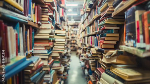 Narrow aisle filled with books overflowing from shelves