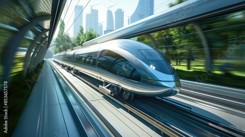 Photograph of a high-speed maglev train speeding through a countryside, connecting major cities in a matter of minutes