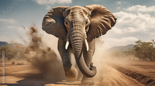 Dostojny słoń biegnący po sawannie w tumanach kurzu