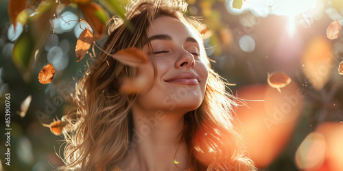 #853900763Image focuses on sparkling sunlight effects around a young girl in nature, whose face is smiling
