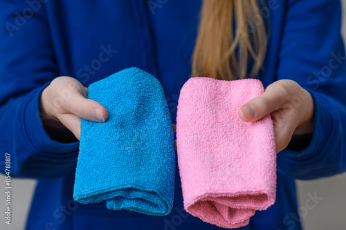 Kobieta trzyma w dłoniach czyste szmatki ściereczki z mikrofibry