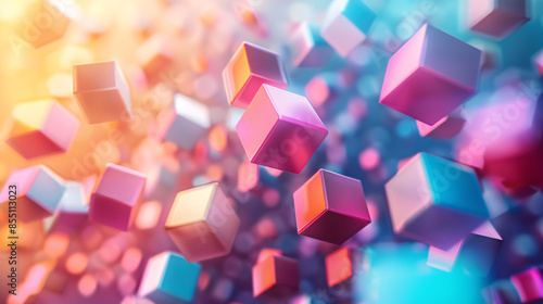 Abstract illustration of floating cubic shapes in various sizes and colors, arranged against a gradient background, creating a dynamic and modern backdrop
