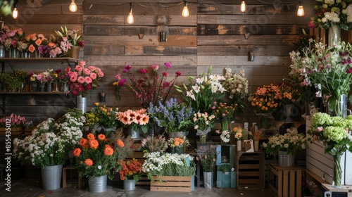 Beautiful arrangement of flowers displayed in a floral store against a wooden backdrop