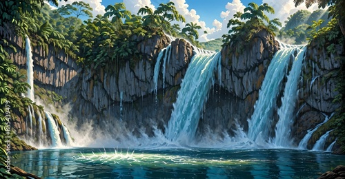 rainforest waterfall in tropical forest nature water. mountain flowing river blue sea in temperate climate.