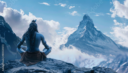 An image of Hindu god Shiva meditating on Mount Kailasa in the Himalayas, depicting spirituality and ancient Hindu culture.