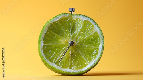In a visually engaging scene, a sliced lime fruit replaces the traditional clock face of an alarm clock, presenting a novel citrus alarm concept. The vibrant green citrus contrasts with a neutral