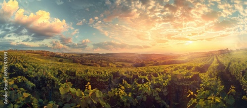 Extra wide panoramic shot of a summer vineyard shot at sunset. Copy space image. Place for adding text or design
