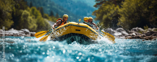 A group of friends white-water rafting down a thrilling river, navigating rapids and enjoying the adrenaline rush.