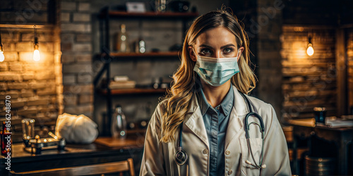Masked doctor with stethoscope in rustic clinic