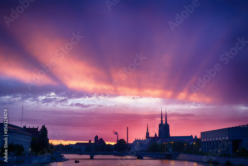 Panorama miasto wrocław nocą. Ostrów Tumski.