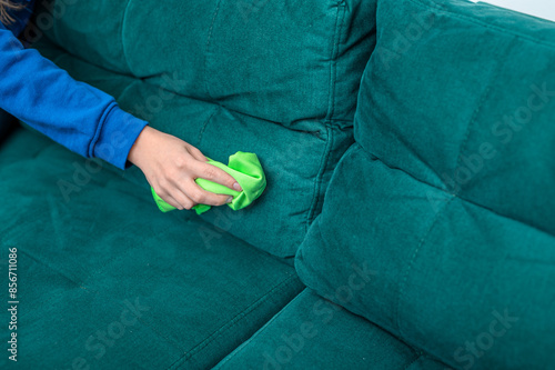 Czyścić kanapę w domu, ręka czyszcząca tkaninę obiciową