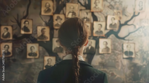 generations connected woman honoring ancestors with family tree of old photographs ai generated illustration
