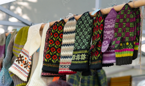 #1062375134Selection of vibrant, handknitted sweaters hanging on a rack in a market stall