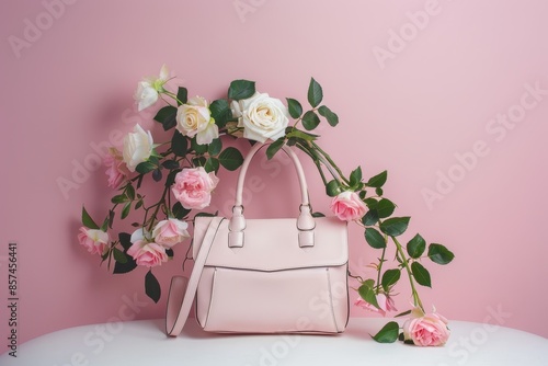 White woman s purser with roses isolated on white and pink background Product photo