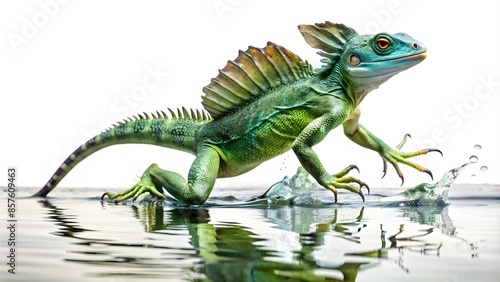 A Bright Green Basilisk Lizard Runs Across The Water'S Surface, Its Sharp Claws Creating A Spray Of Droplets.