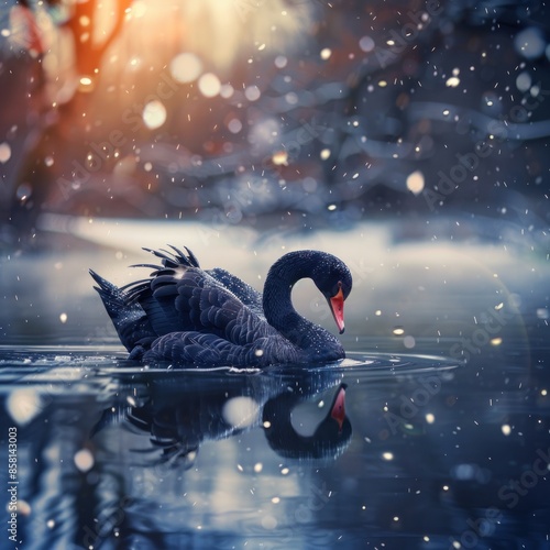 Side View Black Swan Floating on Water Surface with Snow Falling