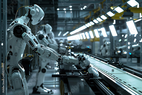 A high-tech factory with robots on an assembly line, manufacturing car body parts efficiently.