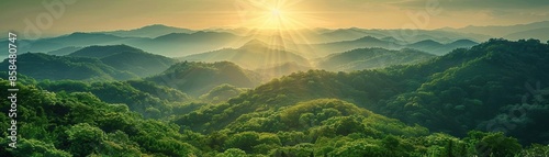 Sunrise over lush, green mountain ranges creates a serene and vibrant natural landscape, evoking a sense of calm and tranquility