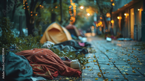 An urban street scene showing a homeless encampment at night, highlighting social issues and the plight of homelessness.