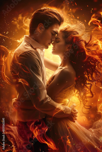 A handsome man passionately kisses a beautiful woman against the backdrop of fire. Love book cover, romance novel illustration.