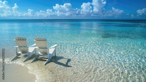 Crystal clear waters lapping gently against the shore, inviting chairs on a pristine sandy beach. Summer bliss awaits. Inspirational tropical beauty captured.