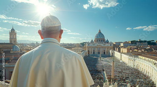 #861319026 Pope surveys a vast congregation in St. Peter's Square, bathed in the golden light of sunset, a view of papal leadership